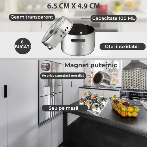 Recipiente magnetice se fixează ușor pe orice suprafață metalică, oferind stabilitate și acces rapid.